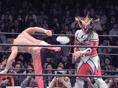 ライガーがカウント16で戻ると顔面狙いのスワンダイブミサイルキック(右写真)、カウント2。