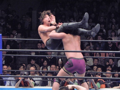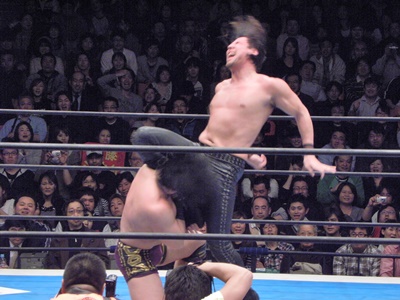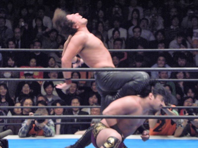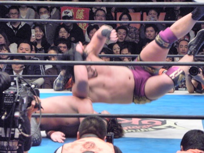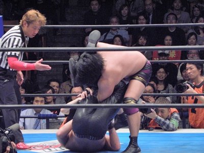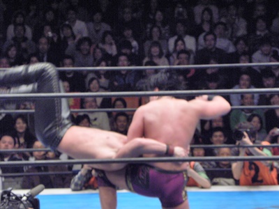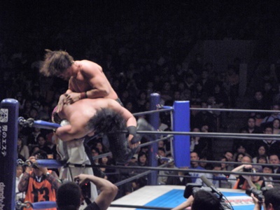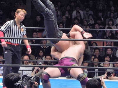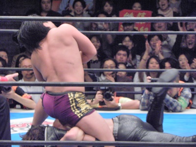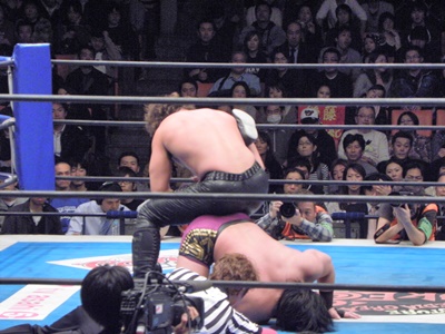 後藤ここがチャンスと見て昇天(右写真)、しかしカウントは2。