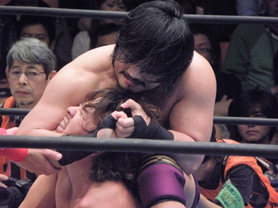 後藤は首にエルボードロップ2発(右写真)、バックドロップ狙うが中邑ロープエスケープ。