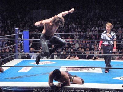 後藤コーナーに振って串刺しラリアット2発、串刺しニールキック、コーナーに上ってダイビングエルボードロップ(左写真)。