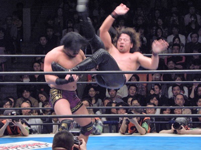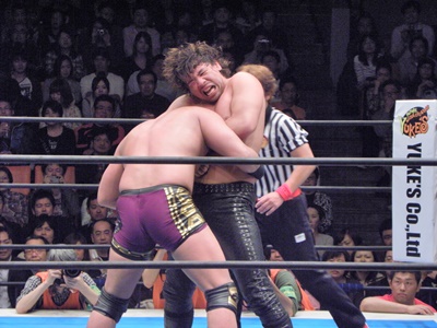 後藤ヘッドバット打ち込んでラリアット(左写真)、カウント2。