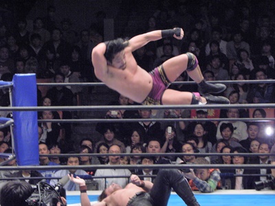 中邑ジャンピングハイキック(右写真)。
