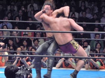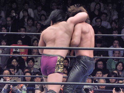 中邑前蹴り、ハイキック。後藤はブロック。後藤タックル、中邑ブロック。後藤片足タックルで倒して足を固める(右写真)。バックの取り合い、ロープブレーク。
