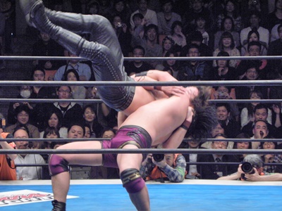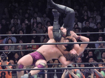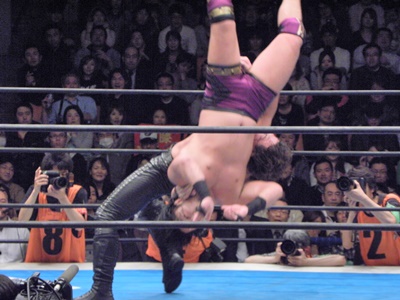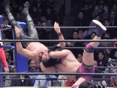 3発目のバックドロップをブロックされると手と足を固めて山嵐流バックフリップ風に投げる(左写真)、カウント2。