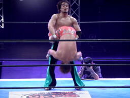 自らもコーナーに上ると雪崩式ブレーンバスター(左写真)、カウント2。