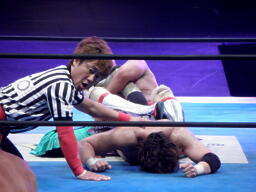 田口ロープに振る、金本切り返してハイキック、田口かわして飛びつき十字固め(左写真)、
