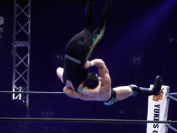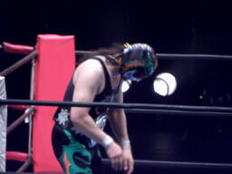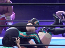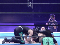 コーナーに上るとダイビングヘッドバット(右写真)、デヴィットかわす。金本が入ってデヴィットにバズソーキック、田口が金本にミサイルキック、サムライは田口にラリアット。