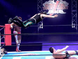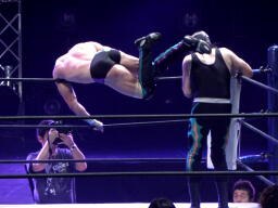 金本ロープに振る、田口ロープに飛び乗るとフライングバックエルボー(右写真)。コーナーに飛び乗って反転ミサイルキック、カウント2。