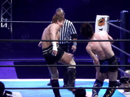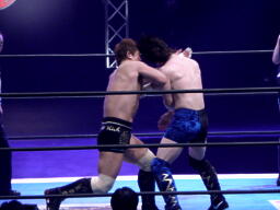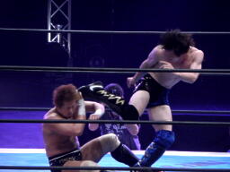 金本ハヤトにソバット、エルボー(左写真)。ハヤトもエルボー返す。