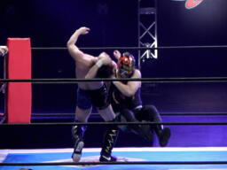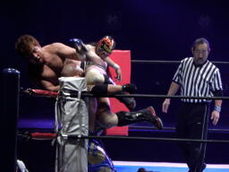 サムライがコーナーに上げて雪崩式リバースDDT(右写真)、