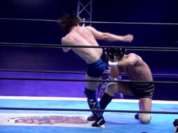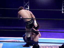野橋ヘッドバット、逆水平連打。サムライヒザ蹴り、後頭部にエルボースタッブ入れてパイルドライバー(右写真)、カウント2。