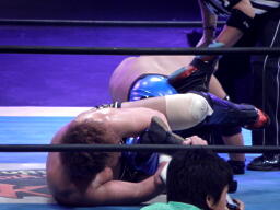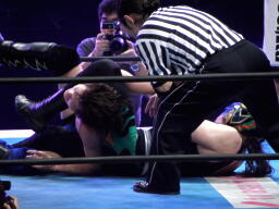 サムライスリーパー(右写真)、ハヤトロープ。しかしサムライは放さず胴締めスリーパーに、野橋がカット。