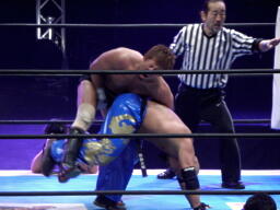 ダブルで振ってサムライ一人がラリアット(左写真)。5分経過。