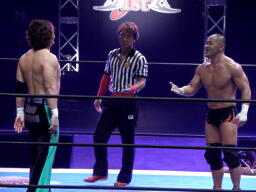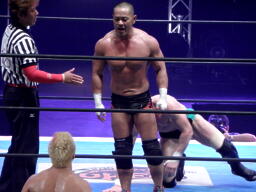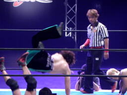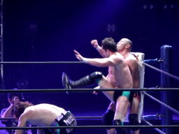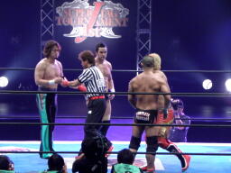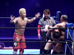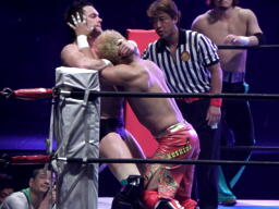 デヴィットがガットショット、外道キャッチしてその足をレフェリーにぶつける。そしてデヴィットに急所蹴り。外道が木槌を持ち出すとKUSHIDAがこれを咎めまたモメる(右写真)。