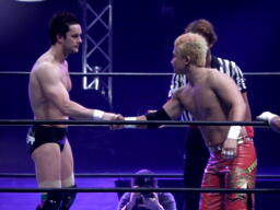 KUSHIDAが外道の制止を振り切ってApollo55と握手しようとする(右写真)。