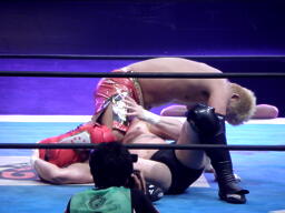 田口リバースゴリースペシャルの体勢に、KUSHIDAブロックして逆さ押さえ込み(左写真)、カウント2。