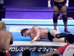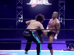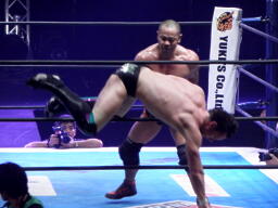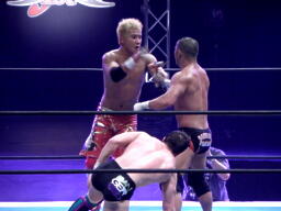 KUSHIDAロープに振ってカウンターのチョップ(右写真)、ハイキックからカバー、田口がカット。KUSHIDAは外道にタッチ。