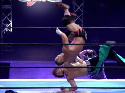 KUSHIDAヘッドシザーズで切り返す(右写真)。デヴィット倒立で脱出するがKUSHIDAは再度ヘッドシザーズ、ブレーク。両軍タッチ。