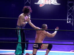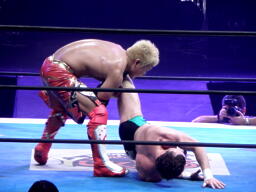 外道がコーナーに連れ帰る。KUSHIDAは捕まえた状態での攻撃を拒否(左写真)。外道しぶしぶ放す。5分経過。