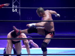 KUSHIDAコーナーに振る、デヴィット切り返して突っ込む、KUSHIDAのかわしてロープに飛ぶ、デヴィットカウンターのドロップキック(右写真)、田口にタッチ。
