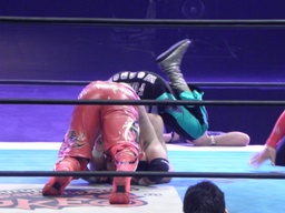 デヴィット切り返しフライングメイヤーからケサ固め(右写真)。デヴィット腕をひねる、KUSHIDA切り返す。
