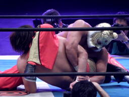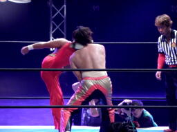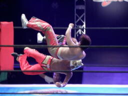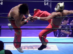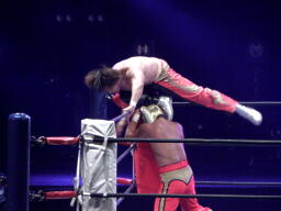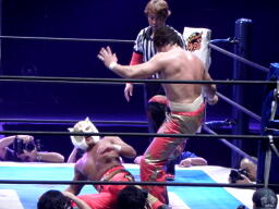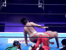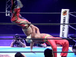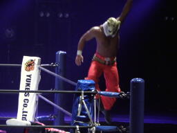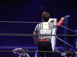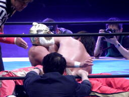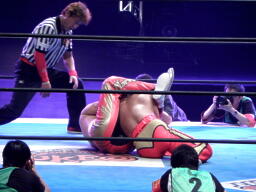丸藤ツームストーンドライバーの体勢、タイガー切り返す、丸藤ブロックしてコーナーを駆け上がると不知火に(右写真)、カウント2。
