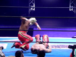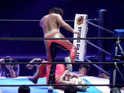 タイガーはコーナーからエプロンの丸藤にダイビングニードロップ(右写真)。さらに場外でタイガードライバー。タイガー先にリングに戻る、丸藤はカウント19で戻る。