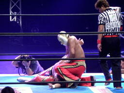 タイガーキック連打、丸藤キャッチ(左写真)、タイガーそれを利用してヒザ蹴り、丸藤エプロンに。