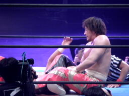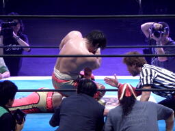 丸藤は5.3にタイガーが挑戦表明して5.8に防衛戦実現という日程に腹立ててるようなコメントしてたが、「潰す」「エグい技で行く」と予告し、その通り頭への蹴りを連発したタイガーに丸藤が「自分だってエグい技持ってるぞ」というところを見せたのだろうか?華麗な技を連発する丸藤にしては出した技が随分少ない防衛戦だった。タイガーはこれでようやく痛い目に遭って泥水すすることになる。ここまであまりに簡単にチャンスを与えられ、苦しまなさすぎたツケが来た感じもある。