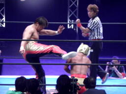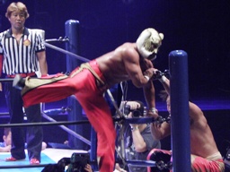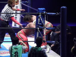 タイガーのロープに絡めて攻める(右写真)、場外に降りて助走を付けてドロップキック、タイガーはカウンターのキック。10分経過。