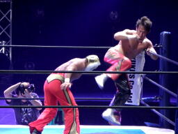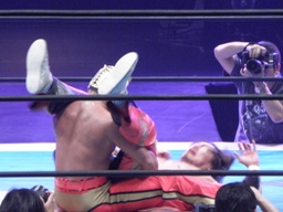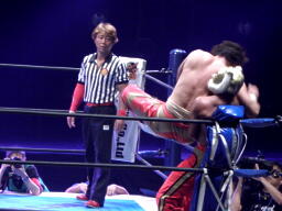 ロープワーク、丸藤が変則的なロープワークを見せるがタイガーはこれを読んでロープをつかんでのキックで丸藤を場外に落とす(右写真)。
