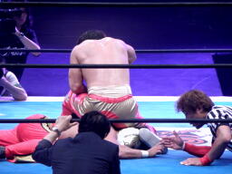 そしてタイガースープレックスホールド(左写真)、カウント2。15分経過。
