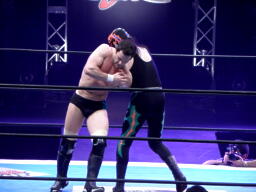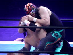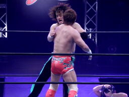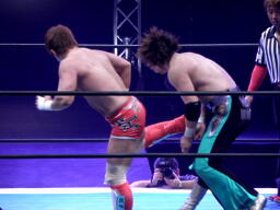 先発はデヴィットとサムライ。ロックアップ、サムライがロープに押し込む、デヴィット体勢を入れ替える(右写真)、ブレーク。