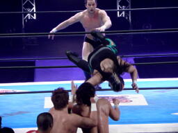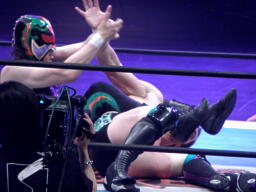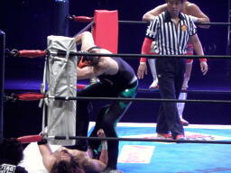 デヴィットが入りサムライとロープワーク、サムライはその勢いでトペ・スイシーダ(右写真)。
