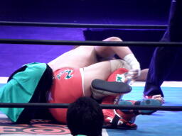 リングに戻ると田口が金本をコーナーに上げて雪崩式ブレーンバスター狙う、サムライが田口をパワーボム、裏摩周の形になり(右写真)金本にダメージ。サムライさん何やっとんの?