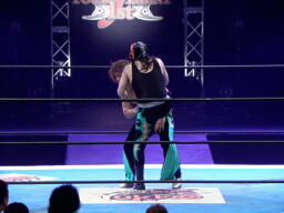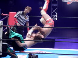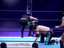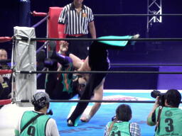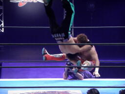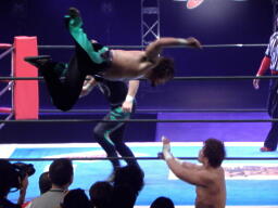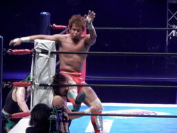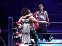 金本ロープに飛ぶ、田口キャッチしてマンハッタンドロップ(右写真)、ホイップで場外に落とす。