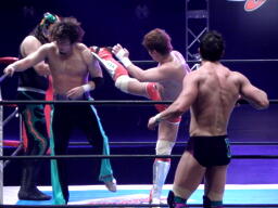 金本ロープに飛ぶ、田口カウンターのドロップキック(左写真)。金本はサムライにタッチ。