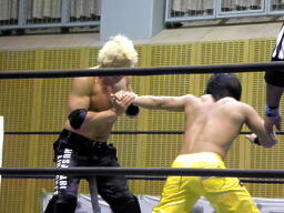AKIRAタックル、バックの取り合い。AKIRAハンマーロック、バック取る、石森腕をひねる、AKIRA切り返す(右写真)、石森回転して切り返す。