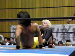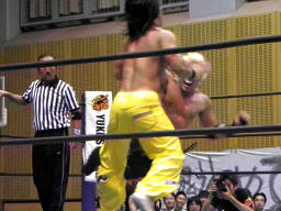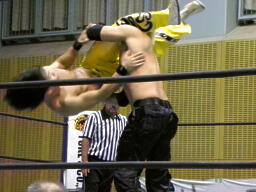 石森ハンマーロックからヘッドロック、AKIRAロープに振ってエルボー、石森かわしてコルバタ(左写真)、AKIRA場外転落。