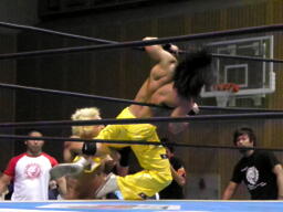 AKIRAは低空延髄蹴りからコーナーに上り、足へのムササビプレス(左写真)、グローイングアップで丸めて3カウント。