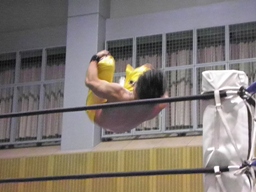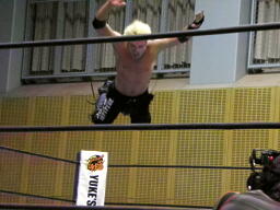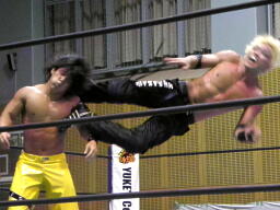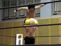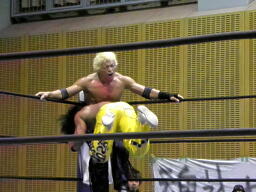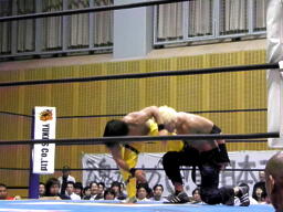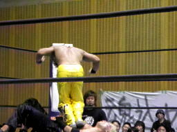 AKIRAコーナーに上って石森の足へのミサイルキック。AKIRA再度コーナーに上る(左写真)、石森立ち上がってコーナーに上る、AKIRA突き落とす。