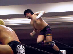 NO LIMITが井上に急所攻撃、場外に出す。花道で高橋が井上にラリアット(左写真)。