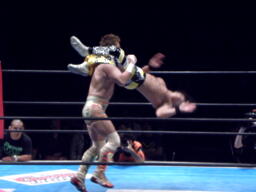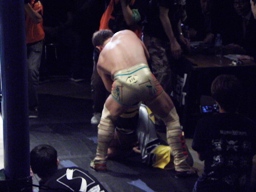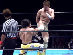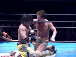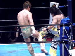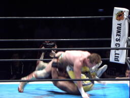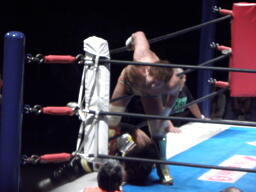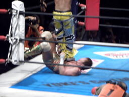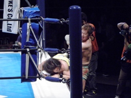 石森コーナーに振る、金本切り返す、石森エプロンに出て蹴ってきた金本の足を取るとロープ越しのドラゴンスクリュー(左写真)。