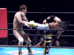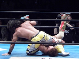 金本バズソーキック、カウント2。変形アンクルホールド(右写真)、石森ロープ。10分経過。