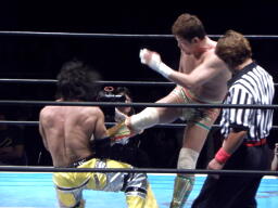 再度のドラゴンスクリューから足4の字(右写真)、金本ロープ。