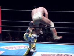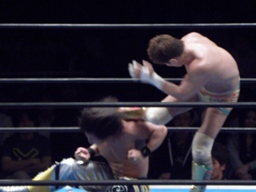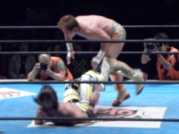 両足をサードロープに引っ掛けた状態の金本にダイビングダブルフットスタンプ(右写真)、カウント2。
