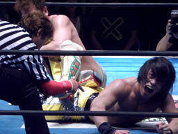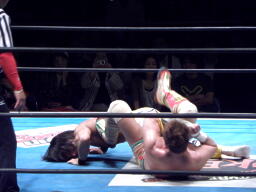 金本足を取る、石森回転して片エビ固め(右写真)、カウント2。