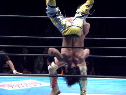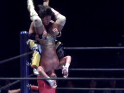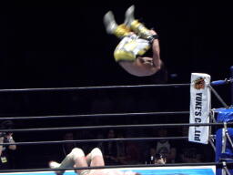 金本ロープに飛ぶ、石森フランケンシュタイナー(左写真)、金本場外転落。