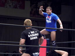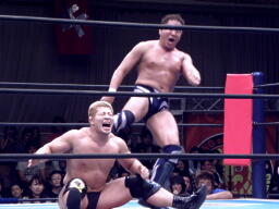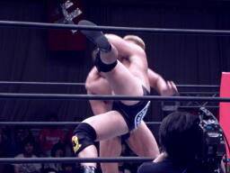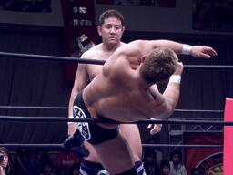 ムーンサルトプレスは永田ヒザでブロック(右写真)、首固め、カウント2。10分経過。