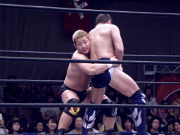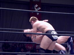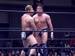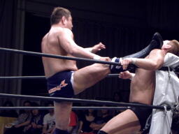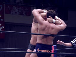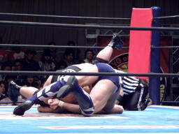 ロックアップ、高橋バック取る(右写真)、永田腕をひねる、高橋切り返す、永田下から蹴ってブレーク。